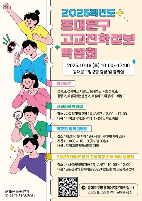 [뉴스스텝] 서울 동대문구는 오는 10월 18일 토요일 오전 10시부터 오후 5시까지 구청 내 다목적 강당, 제2회의실, 사내아카데미에서'2026학년도 고교 진학정보 박람회'를 개최한다고 밝혔다.
