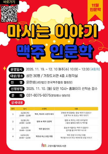 [뉴스스텝] 고양특례시 가좌도서관은 11월 19일부터 12월 10일까지 맥주를 키워드로 한 인문학 프로그램 ‘마시는 이야기, 맥주 인문학’을 운영한다.