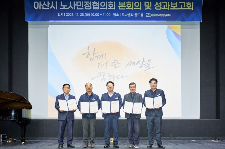 [뉴스스텝] 아산시 노사민정협의회(위원장 오세현 시장)는 23일 모나밸리에서 협의회 위원과 기업 관계자 등 100여 명이 참석한 가운데 ‘2025 아산시 노사민정협의회 성과보고회’를 열고, 올해 협력사업 성과를 공유했다.