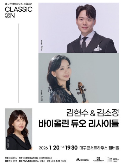 [뉴스스텝] 지역 예술인을 조명하는 대구콘서트하우스 기획공연 시리즈인 ‘클래식 ON’의 2026년 첫 번째 공연인 '김현수 김소정 바이올린 듀오 리사이틀'이 1월 20일 오후 7시 30분 대구콘서트하우스 챔버홀에서 개최된다.