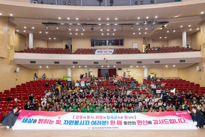 [뉴스스텝] 칠곡군은 지난 3일 칠곡군 왜관읍에 위치한 칠곡군 교육문화회관에서 ‘감동의 봉사, 희망의 칠곡군으로 빛나다’라는 주제로 김재욱 칠곡군수, 이상승 칠곡군의회 의장을 비롯한 주요 기관단체장과 자원봉사자 700여명이 참석한 가운데‘2025년 칠곡군 자원봉사자 대회’를 개최했다.