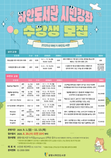 김광용 하안도서관장은 “하안도서관은 시민의 삶에 배움의 기쁨이 스며들 수 있도록 다양한 분야의 강좌를 마련하고 있다”며 “이번 하반기 시민강좌가 일상에 활력을 더하고 세대 간 소통을 넓히는 평생학습의 기회가 되길 바란다”고 말했다.