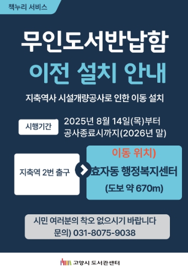고양시도서관센터 길영훈 소장은 “무인도서반납함 이전 설치는 시민 편의를 최우선으로 한 결정”이라며 “공사 기간에도 안정적으로 도서 반납이 가능하니, 이전된 위치에서 무인도서반납함을 펀리하게 이용해 주시기 바란다”고 말했다.