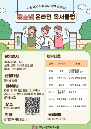 [뉴스스텝] 고양특례시 대화도서관은 8월 30일부터 11월 8일까지 격주 토요일, 중학생 대상의‘청소년 온라인 독서클럽’을 운영한다고 밝혔다.