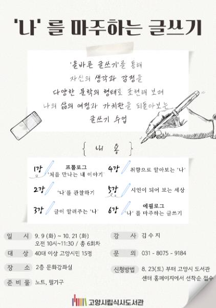 [뉴스스텝] 고양특례시 식사도서관은 오는 9월 9일부터 공공도서관 성인 독서문화 프로그램‘나를 마주하는 글쓰기’을 운영한다.