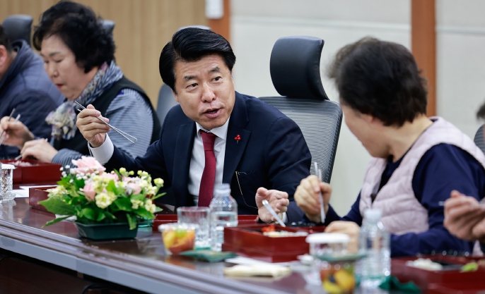 | ▲ 서강석 송파구청장이 2026년 1월 2일 구청 소회의실에서 청사관리 근무자들과 점심을 먹으며 이야기를 나누고 있다. |