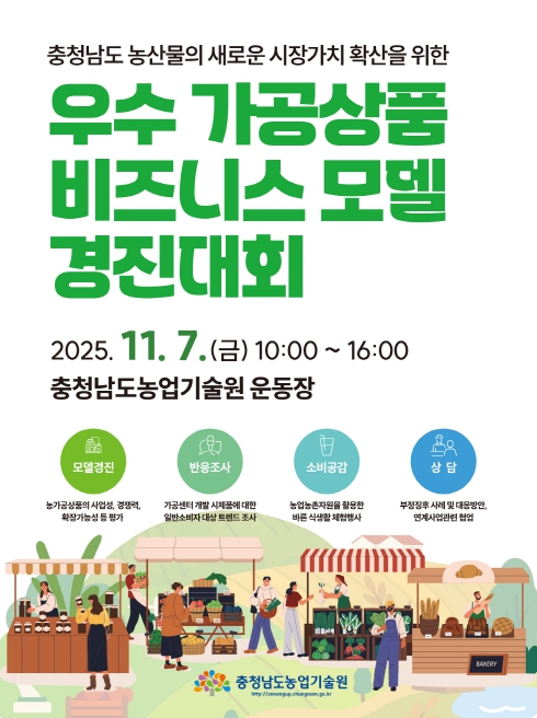 [뉴스스텝] 충남도 농업기술원은 오는 11월 7일 농가공경영체와 전문가, 일반 소비자 등 300여 명이 참석한 가운데 ‘2025년 우수 가공상품 비즈니스 모델 경진대회’를 개최한다고 30일 밝혔다.