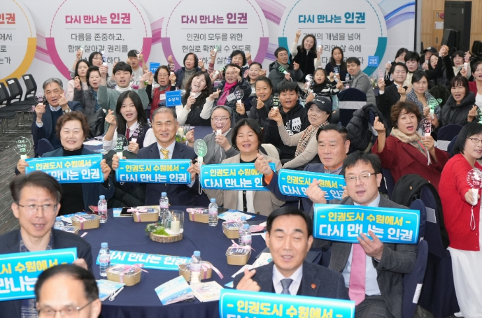 | ▲ 김현수 수원시 제1부시장(앞줄 오른쪽)이 세계인권선언의 날 77주년 기념식 참석자들과 함께하고 있다. |