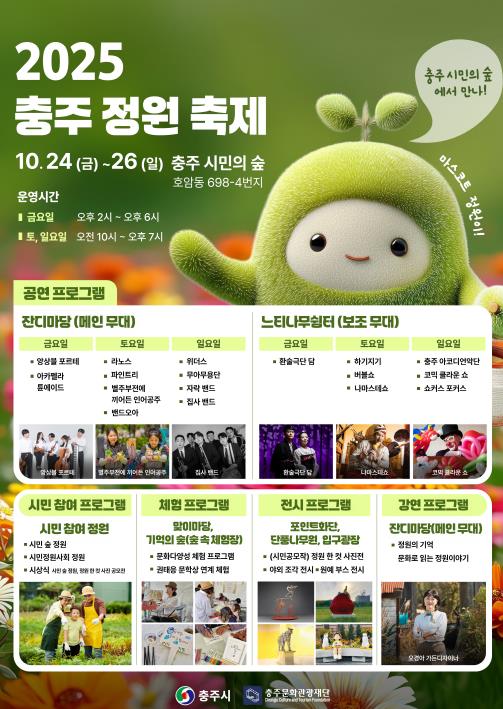 [뉴스스텝] 충주시와 (재)충주문화관광재단은 10월 24일부터 26일까지 3일간 충주 시민의 숲(호암동 698-4번지)에서 ‘2025 충주 정원 축제’를 개최한다고 밝혔다.