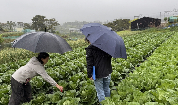 | ▲ 지난해 기장군 농업기술센터 관계자가 배추 재배농가를 방문해 생육현장을 살펴보고 있다. |