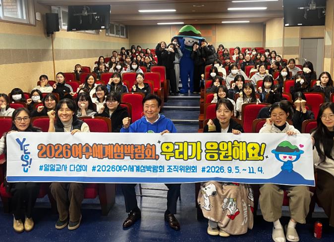 [뉴스스텝] (재)2026여수세계섬박람회 조직위원장 정기명 여수시장이 섬박람회를 알리기 위해 여수 중앙여자고등학교에 일일교사 다섬이로 나섰다.
