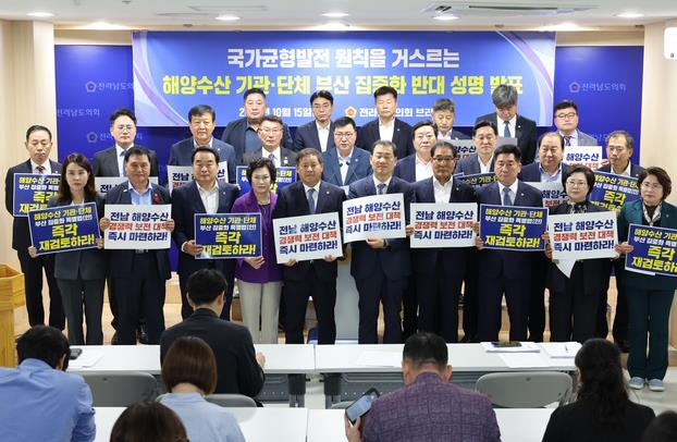 [뉴스스텝] 전라남도의회 농수산위원회 최동익 의원(더불어민주당·여수)은 10월 15일 제394회 임시회 도의회 브리핑룸에서 '국가균형발전 원칙을 거스르는 해양수산 기관·단체 부산 집중화 반대 성명서'를 발표했다.