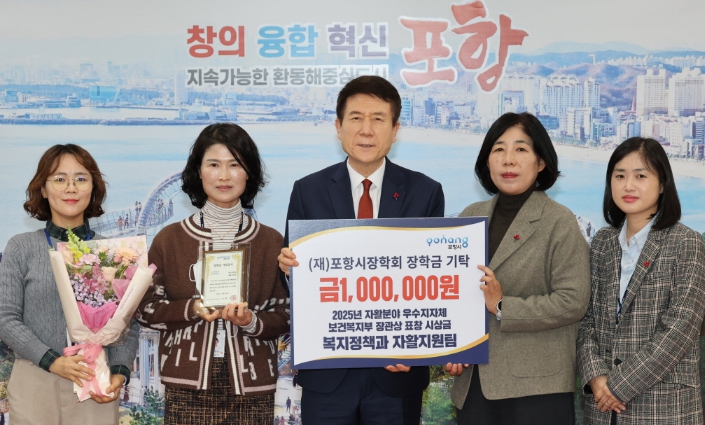 포항시는 2025년 자활사업 우수 지자체로 선정되어 보건복지부 장관 표창을 수상했으며, 이에 따른 포상금 100만원을 지역 인재 양성을 위해 포항시장학회에 장학금으로 기탁했다.