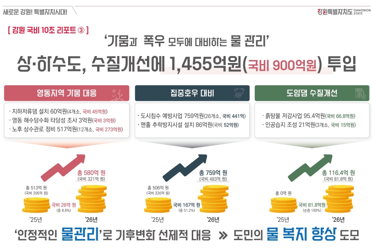 [뉴스스텝] 강원특별자치도는 내년도에 1,455억 원을 투입하여 가뭄 및 집중호우 등 물로 인한 기후변화와 자연재해로부터 안전한 강원자치도를 만들어 나갈 계획을 밝혔다.