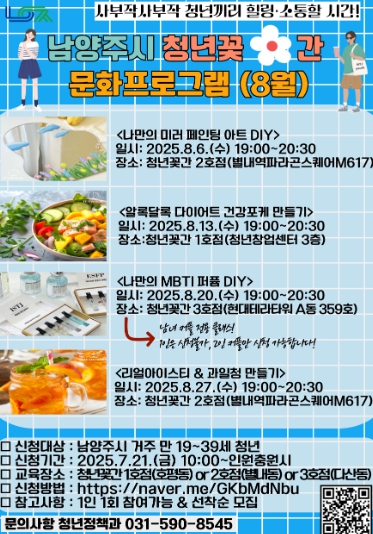 8월에는 ▲미러페인팅아트 DIY ▲건강포케만들기 ▲MBTI 퍼퓸 DIY ▲리얼아이스티&과일청만들기 등 4개의 프로그램이 청년꽃간 1호점(호평동)·2호점(별내동)·3호점(다산동)에서 진행된다.