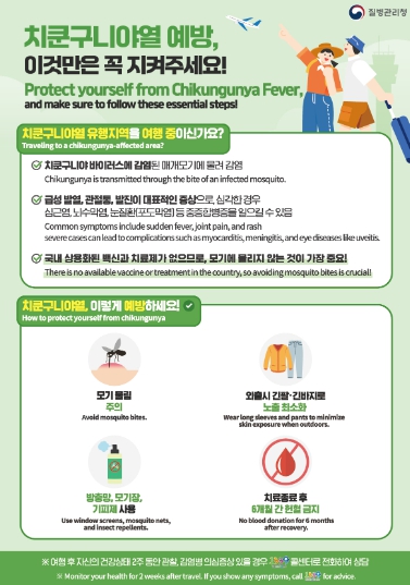 귀국 후 2주 이내에 발열, 관절통, 근육통, 발진 등의 증상이 나타날 경우, 의료기관을 방문해 최근 해외여행력을 알리고 진료를 받아야 하며, 감염병 전파 예방을 위해 4주간은 헌혈을 삼가야 한다.