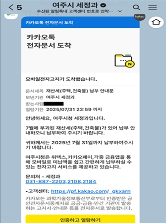 [뉴스스텝] 여주시는 카카오 알림톡을 활용한 지방세 모바일 전자고지 서비스를 도입하고, 지난 7월 28일 정기분 재산세 납기일을 3일 앞두고 미납자를 대상으로 본격 시행했다고 밝혔다.