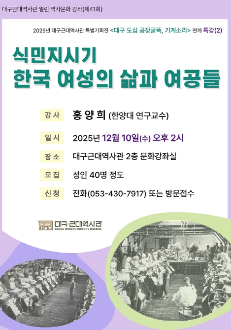 [뉴스스텝] (재)대구문화예술진흥원 박물관운영본부 소속 대구근대역사관은 '대구 도심 공장굴뚝, 기계소리 -근대 대구 섬유 읽기-' 특별기획전과 연계해 12월 10일 오후 2시에 ‘식민지시기 한국 여성의 삶과 여공들’을 주제로 제41회 열린 역사문화 강좌를 개최하며, 참가자를 모집한다.