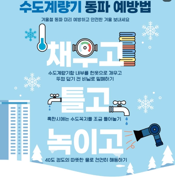 또한 “기온이 급격히 떨어질 때는 계량기함 내부 보온상태를 점검하고, 장기간 외출 시에는 수도꼭지를 조금 열어 물이 흐르도록 하는 등 동파 예방요령을 실천해 주시기 바란다”며, “동파 등 불편 사항 발생 시 관할 시군 상수도부서(야간 당직실)로 즉시 연락해 달라”고 당부했다.