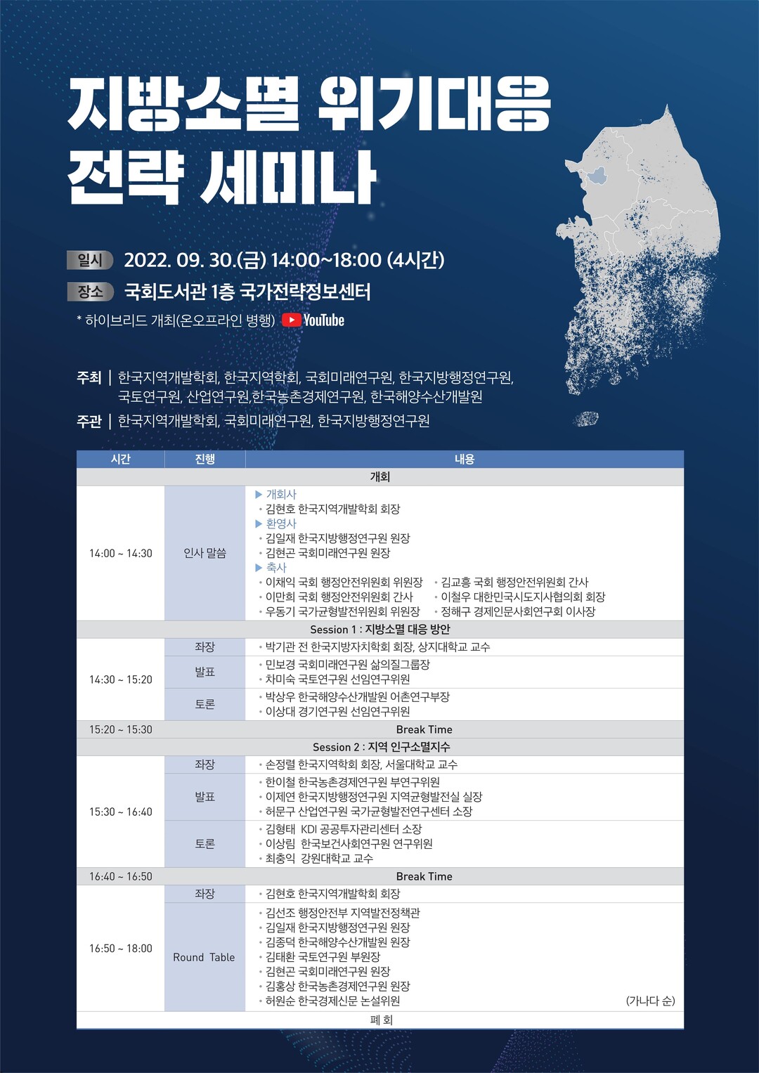 한국지방행정연구원(원장 김일재, 이하 연구원)은 9월 30일(금) 오후 2시 국회도서관 1층 국가전략정보센터에서 국회미래연구원, 한국지역개발학회, 한국지역학회, 국토연구원, 산업연구원, 한국농촌경제연구원, 한국해양수산개발원과 공동으로 온·오프라인 하이브리드 방식(‘한국지방행정연구원’ 유튜브 채널 생중계)의 ‘지방소멸 위기대응 전략 세미나’를 개최한다고 밝혔다.