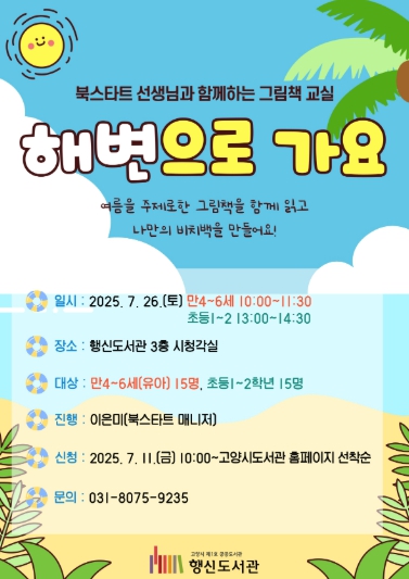 [뉴스스텝] 고양특례시 행신도서관이 만4~6세 유아와 초등학교 1~2학년을 대상으로 한 그림책 교실‘해변으로 가요’를 7월 26일 진행한다고 밝혔다.