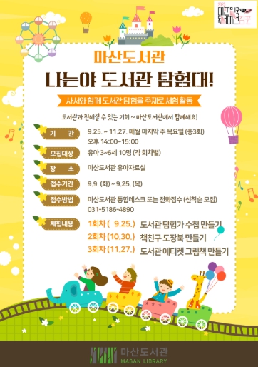강의 신청은 9월 9일 오전 10시부터 마산도서관 통합 데스크를 방문하거나 전화로 예약할 수 있으며, 대상은 유아 3~6세로 총 10팀을 선착순으로 모집한다.