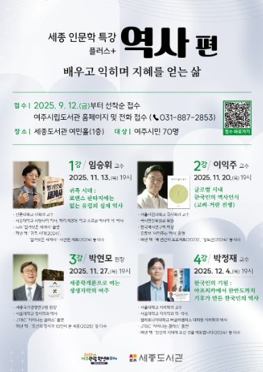 [뉴스스텝] 여주시는 오는 11월 13일부터 12월 4일까지 세종도서관 여민홀(1층)에서 '세종 인문학 특강 플러스+' ‘역사 편’을 4회 운영한다.