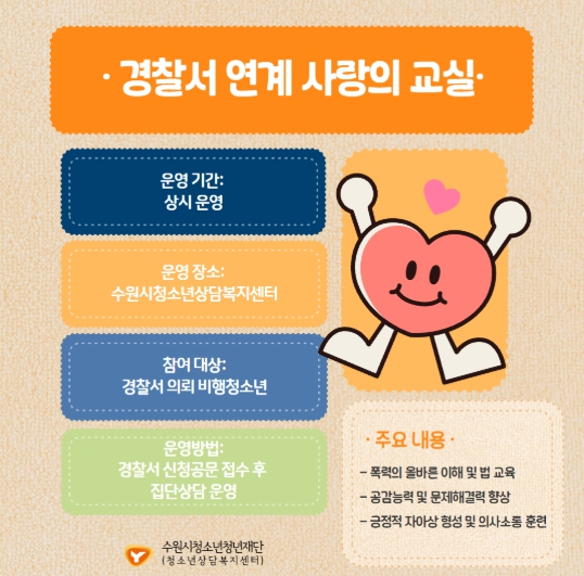 [뉴스스텝] 수원시청소년청년재단 수원시청소년상담복지센터는 수원영통경찰서와 수원팔달경찰서에서 의뢰된 비행청소년을 대상으로 ‘사랑의 교실’프로그램을 연중 운영하고 있다.