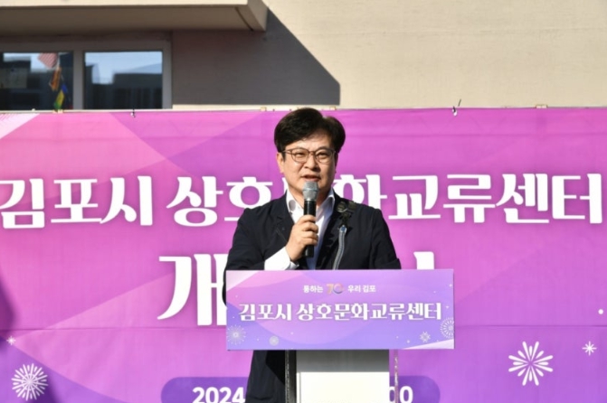 ▲ 김병수 김포시장이 지난 2024년 10월 김포시상호문화교류센터 개관식에서 축사를 하고 있다. |