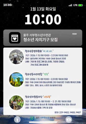 이번 청소년 자치기구 모집은 1월 13일부터 2월 21일까지 진행되며, 자세한 사항은 울주 서부청소년수련관 홈페이지 및 전화 문의를 통해 확인할 수 있다.