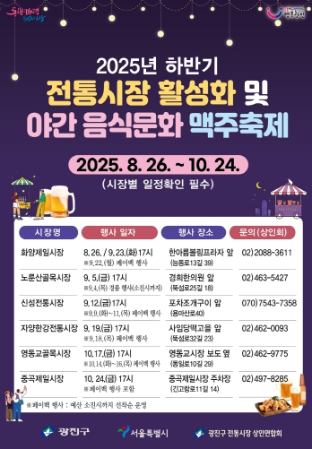 [뉴스스텝] 광진구가 전통시장에 활기를 불어넣기 위해 오는 10월까지 ‘2025 전통시장 축제 및 야간·음식문화 활성화 맥주축제’를 개최한다.