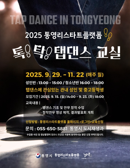 [뉴스스텝] 통영시는 통영리스타트플랫폼에서 성인과 중·고등학생을 대상으로 하는 〈통영예술창작학교: 톡!탁! 탭댄스 교실〉 수강생을 오는 15일 월요일부터 23일 화요일까지 모집한다고 11일 밝혔다.