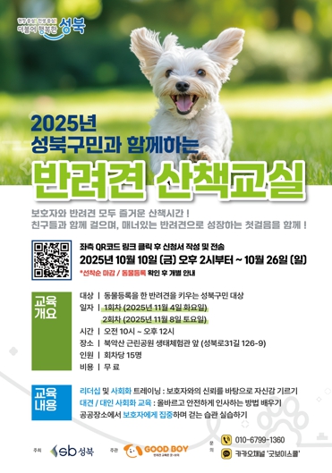 [뉴스스텝] 서울시 성북구가 11월 4일과 8일 전문가와 함께하는 체험형 반려견 산책교육을 실시한다. 이번 교육은 성북구민과 반려견이 함께 참여해 산책 습관과 사회화 훈련을 배우는 프로그램이다.