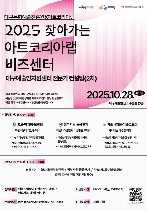 오는 10월 25일 대구예술발전소 수창홀에서 열리는 2차 컨설팅은 문화체육관광부 산하 예술경영지원센터의 ‘찾아가는 아트코리아랩 비즈센터’와 협력해 진행된다.