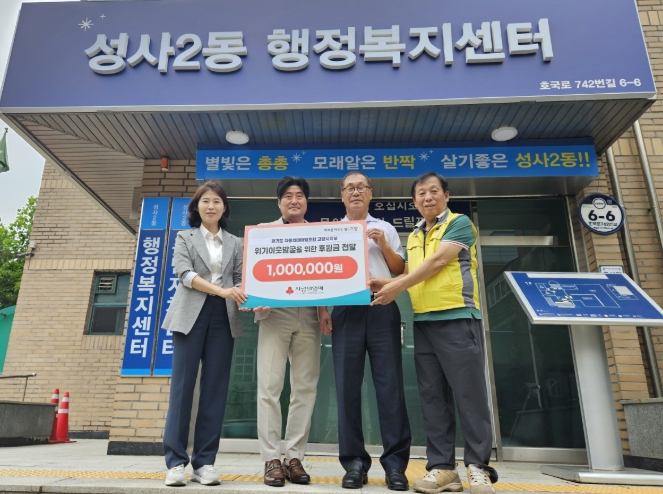 전달식에는 경기도 자동차매매조합 고양시지부 지부장과 부지부장, 성사2동장, 지역사회보장협의체 민간위원장이 참석했으며, 이웃돕기 성금 100만 원을 후원했다.