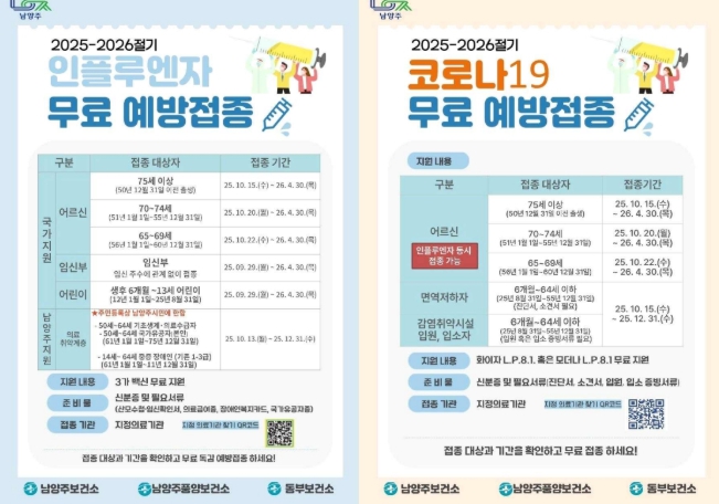 남양주시, ‘2025-2026절기 코로나19·인플루엔자 무료 예방접종’ 실시