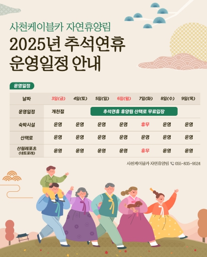 [뉴스스텝] 사천시는 다가오는 2025년 추석 연휴 기간 동안 ‘사천케이블카 자연휴양림’을 정상 운영한다고 22일 밝혔다.