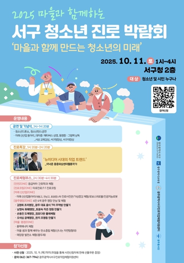 김이강 서구청장은 “이번 진로박람회는 ‘착한도시 서구’의 지역사회가 함께 청소년의 미래를 응원하는 뜻깊은 자리”라며 “청소년들이 마을과 함께 성장하며 자신의 꿈을 구체화하는 계기가 되길 바란다”고 말했다.