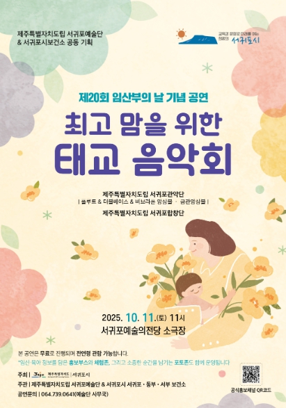 [뉴스스텝] 서귀포시는 오는 10월 11일 11시 서귀포예술의전당 소극장에서 제주특별자치도립 서귀포예술단과 서귀포보건소가 공동으로 주관하는 제20회 임산부의 날 기념 공연 '최고 맘을 위한 태교음악회'를 개최한다.