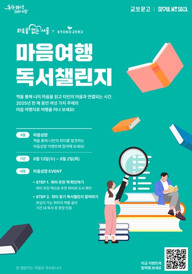 서울시는 ‘외로움 없는 서울’을 만들어가기 위해 다양한 사업을 추진중이며 그중의 하나로 ‘365서울챌린지’를 시행하고 있다. 교보문고와 협력하여 진행하는 ‘마음여행 독서챌린지’는 ‘365서울챌린지’ 사업의 일환이며 올해 12월까지 짝수달마다 6회 동안 매번 다른 주제로 운영된다.