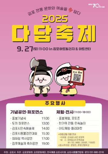 ‘2025 다담축제’는 9월 27일 11시부터 20시 30분까지 김포아트빌리지에서 진행할 예정이다. 중봉 조헌 선생이 외친 ‘지부상소’를 현대적으로 해석한 퍼레이드와 중봉문화제, 김포예술제, 한가위 행사, 민속예술 및 풍물경연 등 다채로운 행사로 채워진다.
