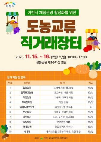 [뉴스스텝] 이천시는 오는 11월 15일부터 16일까지 2일간, 설봉공원 제1주차장 일원에서 ‘2025년 제1회 이천 도농 교류 직거래 장터’를 개최한다.
