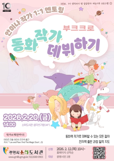 주요 프로그램으로는 ▲2월 20일 안미나 작가의 ‘동화 분야 전자책 출판 1:1 멘토링’을 시작으로 ▲2월 25일에는 고보 작가의 자기 이해와 공감을 돕는 ‘셀프 공감의 기술’ 강연이 열린다. 이어 ▲2월 27일에는 김소형 작가와 함께 수상작 소설을 읽고 깊이 있는 감상을 나누는 ‘수상작을 읽는 시간’이 마련돼 있다.