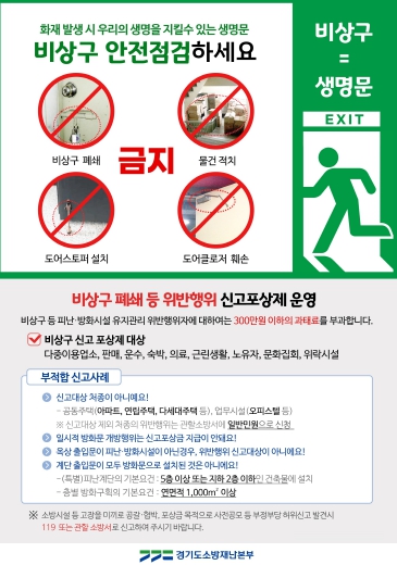[뉴스스텝] 광명소방서는 비상구 폐쇄 등 피난·방화시설 유지관리 위반행위에 대해 시민의 자발적 신고를 활성화하기 위한 ‘신고포상제’를 강도 높게 운영하고 있다고 5일 밝혔다.