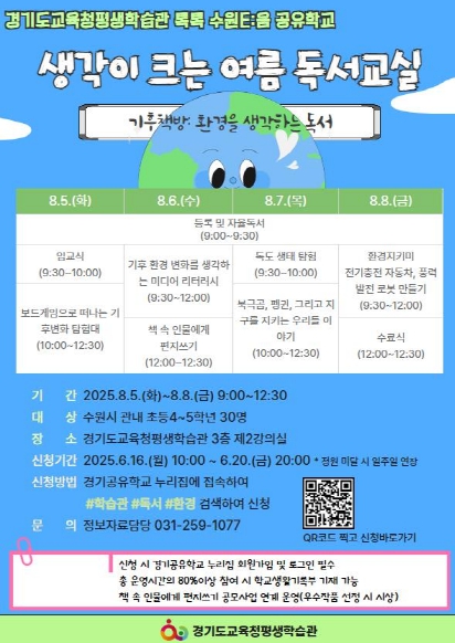 5일부터 8일까지 운영되는 이번 독서교실은 ‘기후책방: 환경을 생각하는 독서’를 주제로 학생들의 환경 의식 함양과 기후 변화 대응 역량을 키우기 위해 마련됐다.