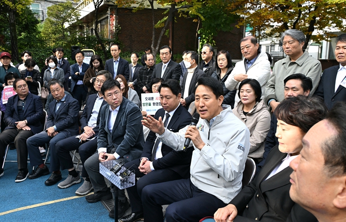 | ▲ 오세훈 서울시장이 6일 오전 성북구 장위13구역 재정비촉진사업 현장을 방문해 주민들과 간담회하고 있다. |