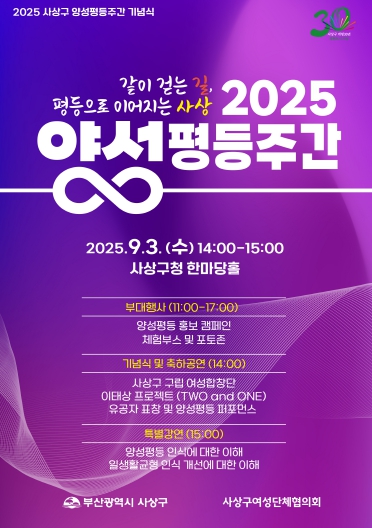 사상구 관계자는 “이번 양성평등주간 행사가 구민 모두가 성평등 가치와 일·생활 균형의 중요성을 공감하는 계기가 되길 바란다”며 “앞으로도 평등하고 건강한 지역사회 조성을 위해 지속적으로 노력하겠다”고 밝혔다.