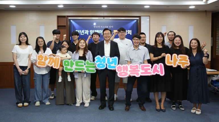 ▲ 윤병태 나주시장이 지난 7월에 개최한 청년소통간담회에 참석한 청년들과 함께 사진 촬영을 했다 |