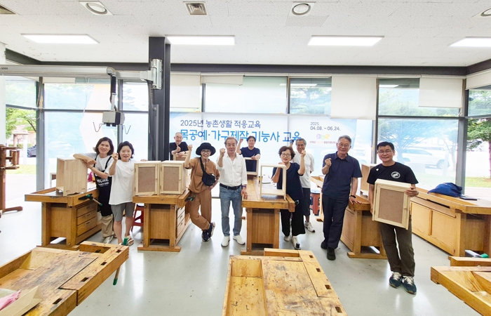 ‘목공예‧가구제작 기능사 과정’은 지난 4월부터 9월까지 총 15회차에 걸쳐 진행됐으며, 국가기술자격증 취득 안내, 이론 및 실기교육, 수공고 활용법 등 실무 중심의 커리큘럼으로 구성됐다. 예비 귀촌인 13명이 이 교육을 수료했다.