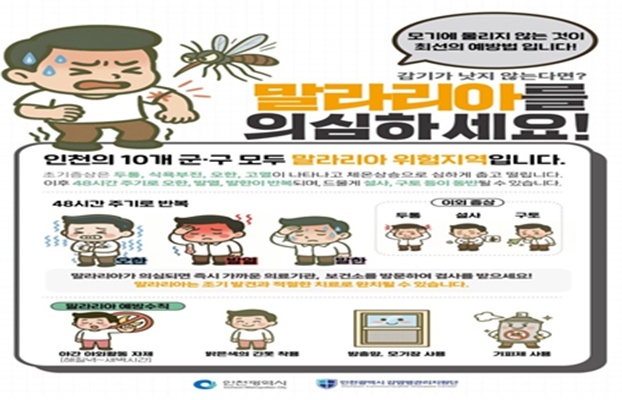신병철 시 보건복지국장은 “인천 10개 군·구 전역이 모두 말라리아 위험지역인 만큼 각별한 주의가 필요하다”며 “야간 야외활동 자제, 밝은 색의 긴 옷 착용 및 모기기피제 사용 등 예방수칙을 지켜달라”라고 당부했다.